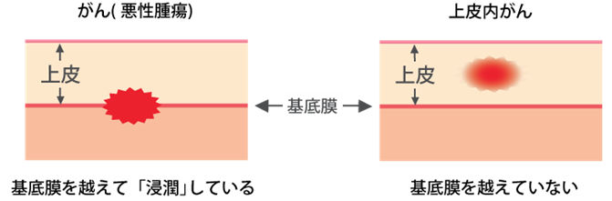 悪性新生物とよく比較されるものに上皮内新生物があります。悪性新生物、上皮内新生物は、どちらもがん細胞です。悪性新生物と上皮内新生物の違いは、がん細胞がどこにとどまっているかにあります。基底膜を超えずに上皮にとどまっているのが上皮内新生物、基底膜を超えて深く浸潤しているのが悪性新生物です。悪性新生物は血管やリンパ管を通じ、全身に転移する可能性がありますが、上皮内がんは浸潤や転移の可能性がありません。